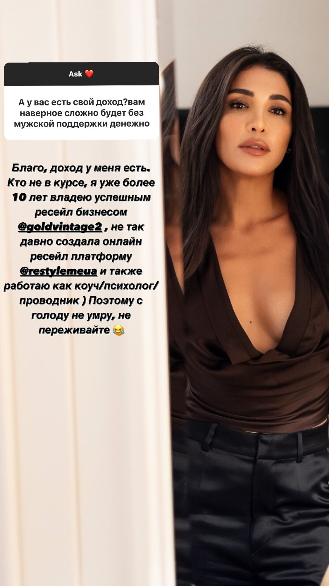 "Благо, доход у меня есть. Кто не в курсе, я уже более 10 лет владею успешным ресейл-безнесом. Также работаю как коуч, психолог, проводник. Поэтому с голоду не умру, не переживайте", – ответила она.