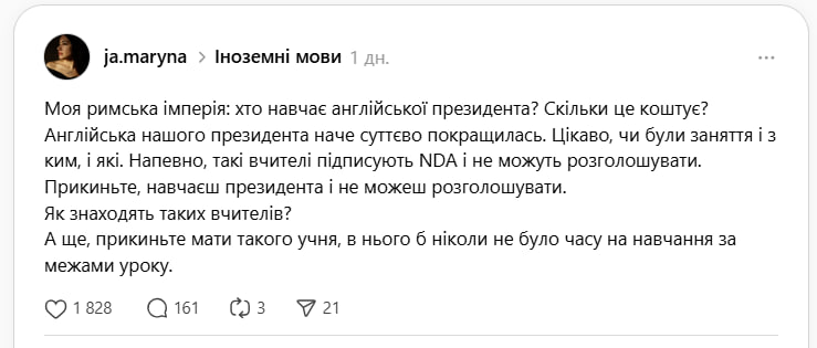 "Кто учит английскому президента? Сколько стоит это? Английский нашего президента как будто существенно улучшился. Интересно, были ли занятия, и с кем, и какие. Наверняка такие учителя подписывают NDA и не могут разглашать. Прикиньте, учишь президента и не можешь разглашать. Как находят таких учителей?" – подняла тему для обсуждения в соцсети Яновская.