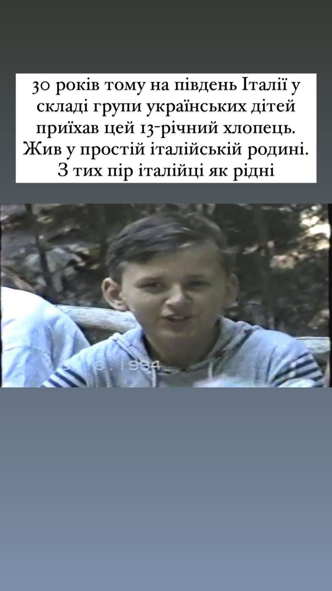 "30 лет назад на юг Италии в составе группы украинских детей приехал этот 13-летний мальчик. Жил в простой итальянской семье. С тех пор итальянцы – как родные", – написал 42-летний министр, которому через два дня исполнится 43 года.