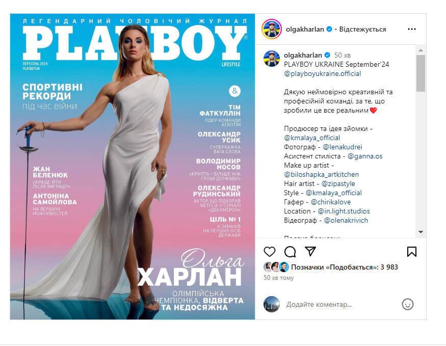 Самая титулованная украинская спортсменка, фехтовальщица на саблях Ольга Харлан стала героиней нового номера украинского издания Playboy. Об этом она сообщила 20 сентября в Instagram, разместив фото обложки со своим изображением.