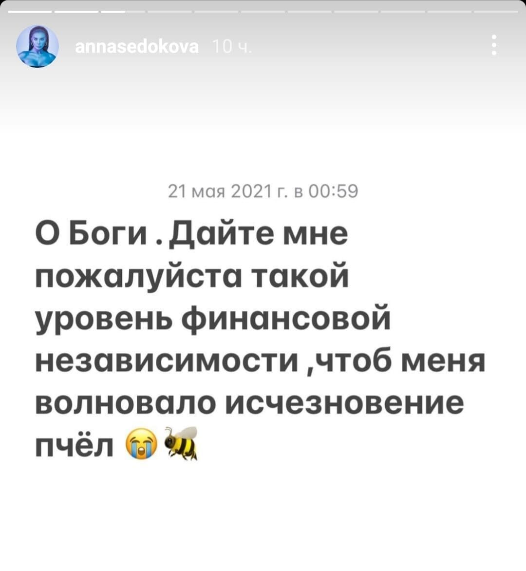 Российская певица украинского происхождения Анна Седокова 21 мая в Instagram Stories отреагировала на фотосессию полуобнаженной американской актрисы Анджелины Джоли с пчелами, целью которой было привлечь внимание общественности к вымиранию насекомых.