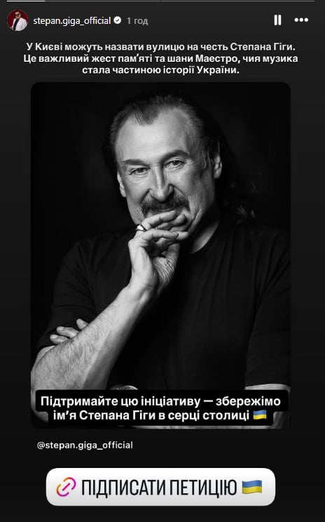 "В Киеве могут назвать улицу в честь Степана Гиги. Это важный жест памяти и уважения маэстро, чья музыка стала частью истории Украины", – говорится в публикации.