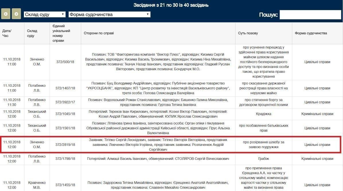 Как указано в материалах Обуховского райсуда Киева, Сергей и Виктория Тигипко подали заявление на развод, которое суд должен был рассмотреть 11 октября.