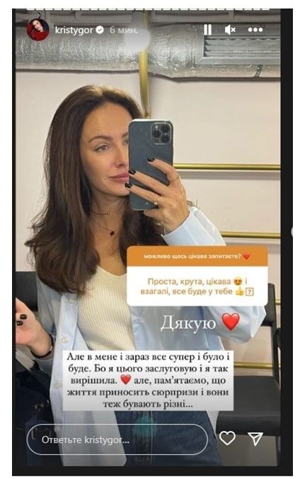 "Но у меня и сейчас все супер – и было, и будет. Потому что я этого заслуживаю и я так решила. Но помним, что жизнь приносит сюрпризы и они бывают разными", – ответила Кристина Остапчук.