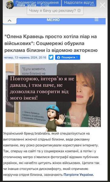 Экс-участница студии "Квартал 95", украинская актриса Елена Кравец оказалась в эпицентре скандала после того, как стала лицом женского белья, которое создал украинский бренд brabrabra для украинских защитниц. Одной из первых на рекламную кампанию бренда 13 июня обратила внимание на своей странице в социальной сети X украинская военнослужащая Алина Сарнацкая.