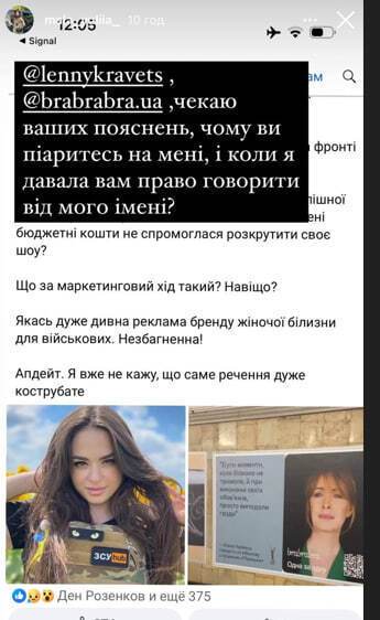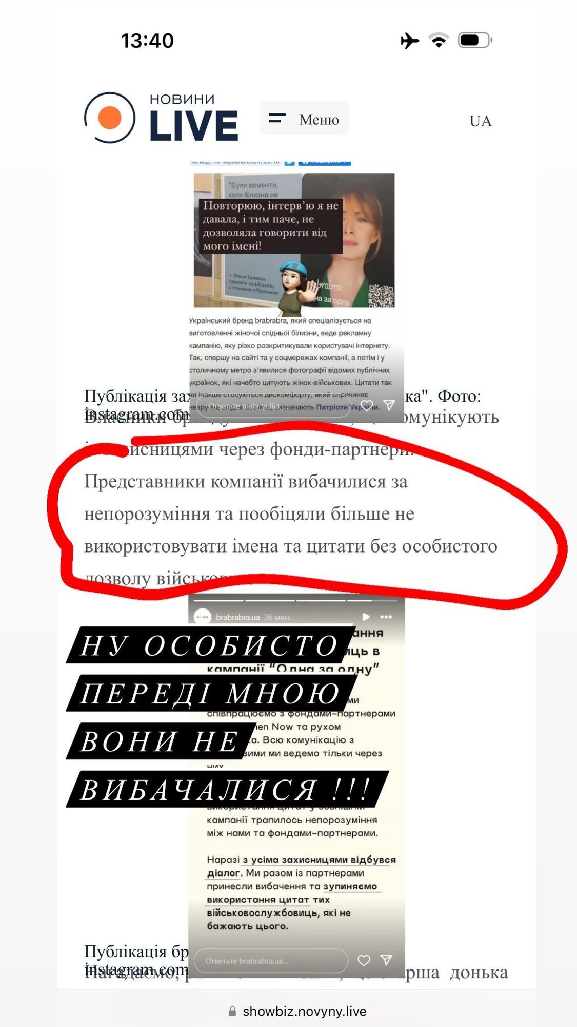 После комментариев бренда ситуацию прокомментировала военнослужащая Юлия Мала (Пиранька). В Instagram Stories она заявила, что не только не давала разрешения говорить от ее имени, но и не произносила слова, которые указаны на плакате.