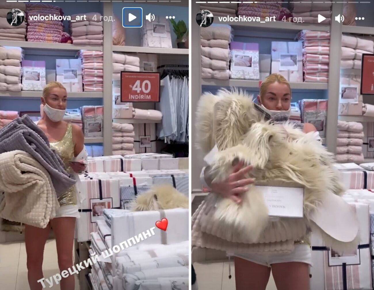 В Instagram Stories она выложила видео шопинга. "Дорогие мои, что еще можно сделать в Турции? Прийти в магазин текстиля и купить здесь очень классные вещи", – говорит в ролике балерина, держа в руках несколько покрывал, и добавляет, что много чего накупила для бани.