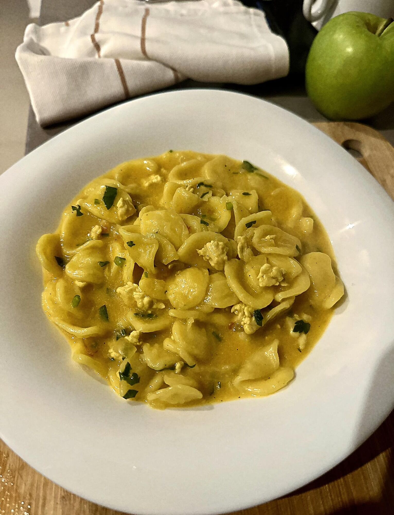 Мозговая показала приготовленное блюдо – домашнюю пасту с индейкой, луком, чесноком, сливками, петрушкой, курицей, черным перцем, оливковым маслом. По словам продюсера, ее девятилетняя дочь Соломия оценила блюдо.