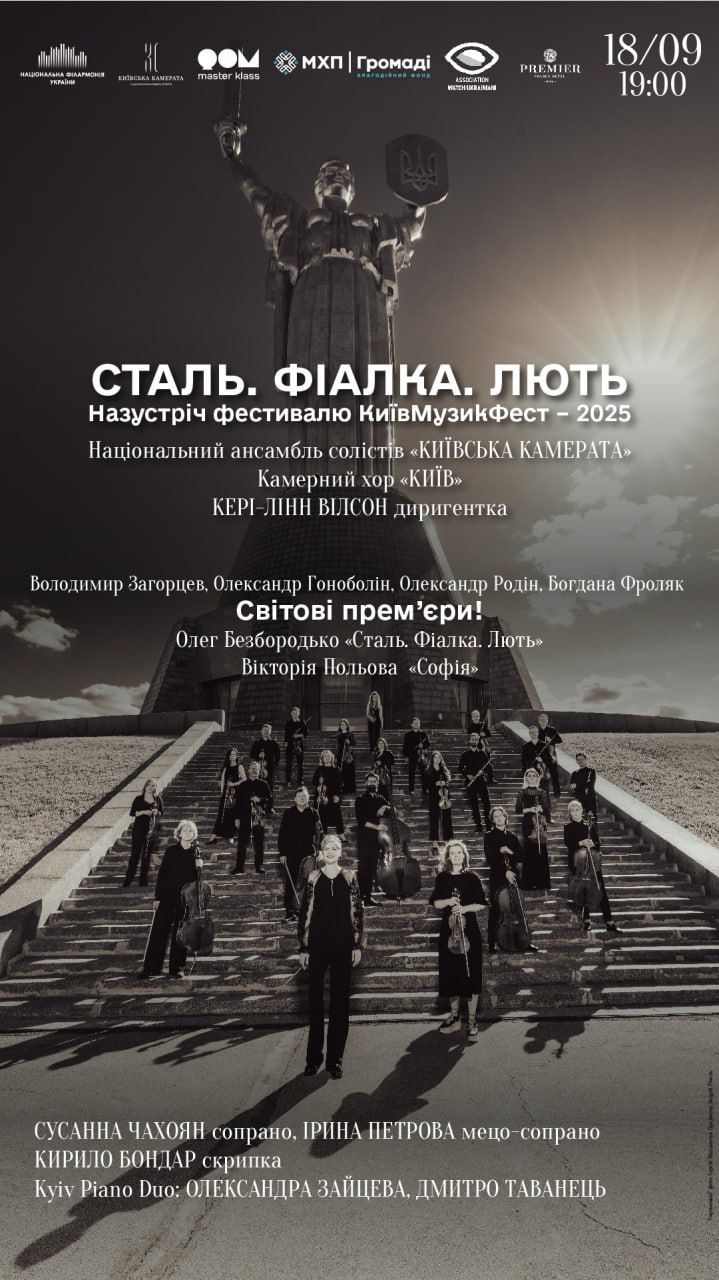 Зрители услышат первый в истории украинской музыки концерт для фортепиано в четыре руки и струнного оркестра "Сталь. Фіалка. Лють" Безбородько, созданный в 2024 году для Kyiv Piano Duo, и "София" для хора и оркестра Полевой.