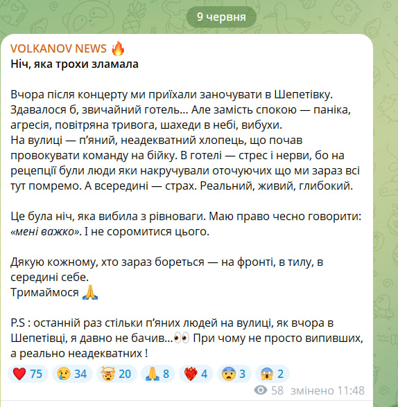 "Ночь, которая немного сломала. Вчера после концерта мы приехали переночевать в Шепетовку. Казалось бы, обычный отель. Но вместо спокойствия – паника, агрессия, воздушная тревога, шахеды в небе, взрывы, – написал он. – На улице – пьяный неадекватный парень, который начал провоцировать команду на драку. В отеле – стресс и нервы, потому что на репетиции были люди, которые накручивали, что мы сейчас все здесь умрем".