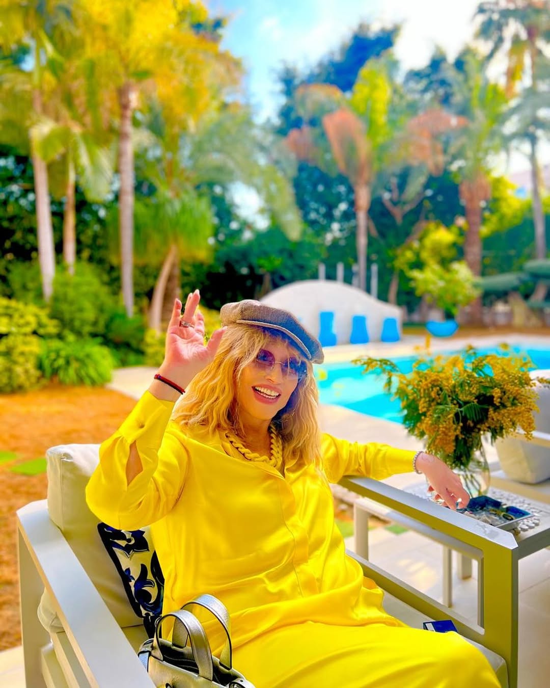 На фото 75-летняя Пугачева сидит в кресле на фоне бассейна и пальм. Одета она в костюм желтого цвета. Свой образ певица дополнила коричневым беретом и солнцезащитными очками.