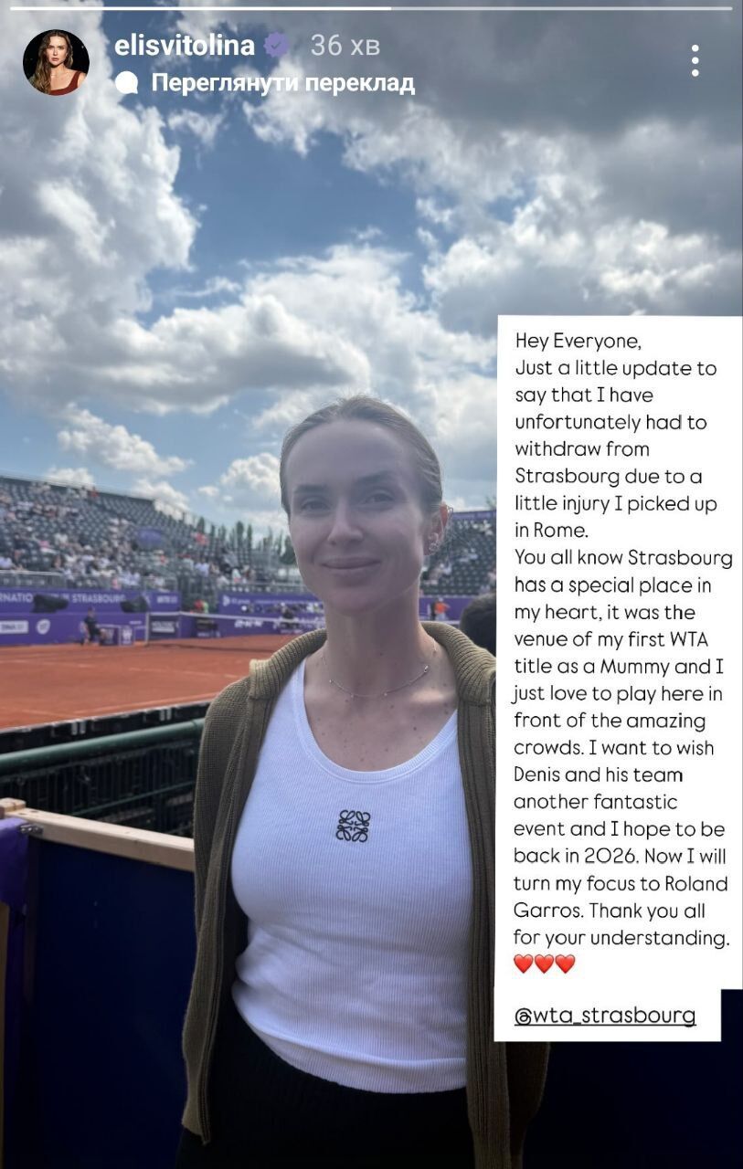 Первая ракетка Украины Элина Свитолина 17 мая в Instagram Stories опубликовала сообщение, в котором прокомментировала свой отказ от участия в международном теннисном турнире в Страсбурге (Франция).