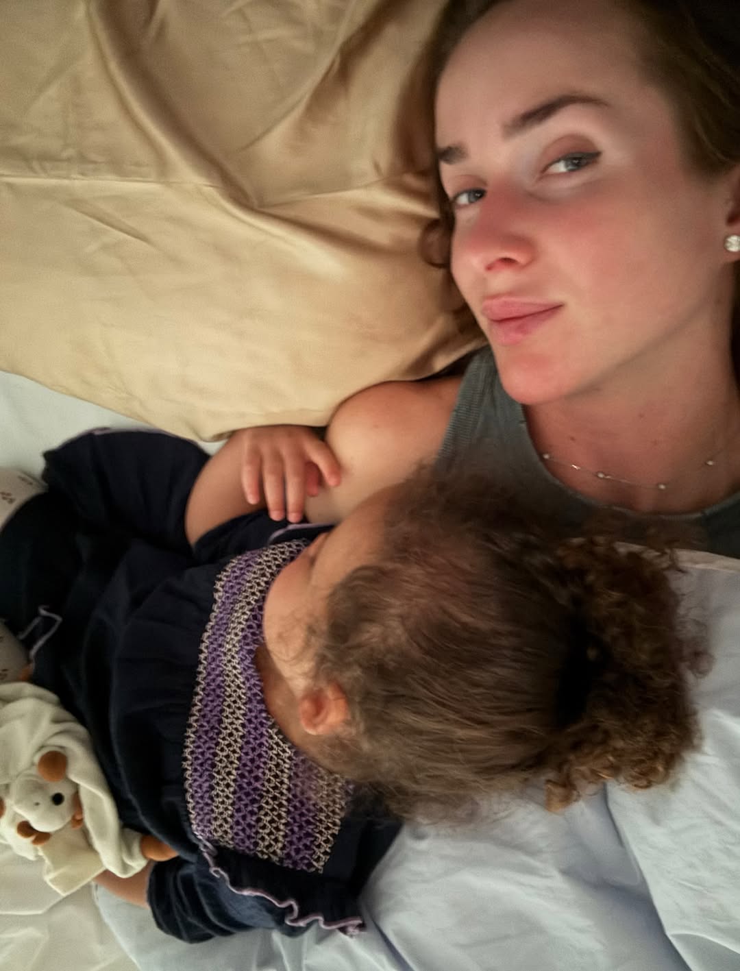 Мать и дочь позируют, лежа в обнимку в постели. Это первое фото, на котором Свитолина не стала скрывать лицо дочери.