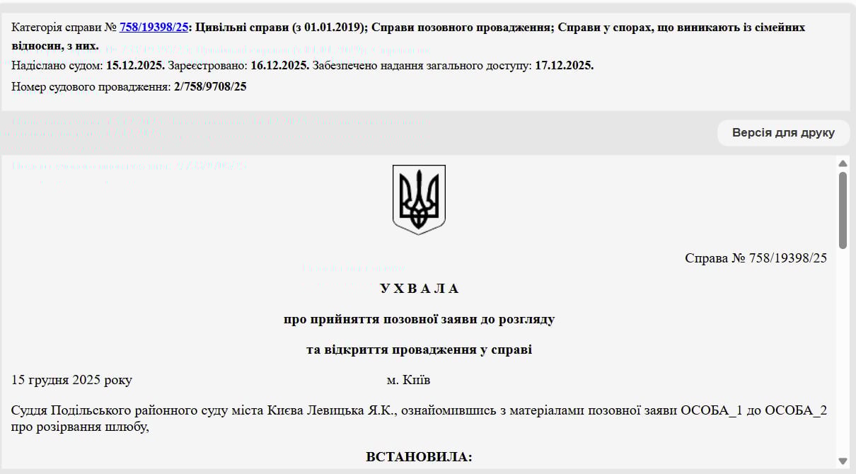Судебное дело по иску о разводе, инициатором которого стал Тарас Тополя, зарегистрировано 3 декабря под №758/19398/25.