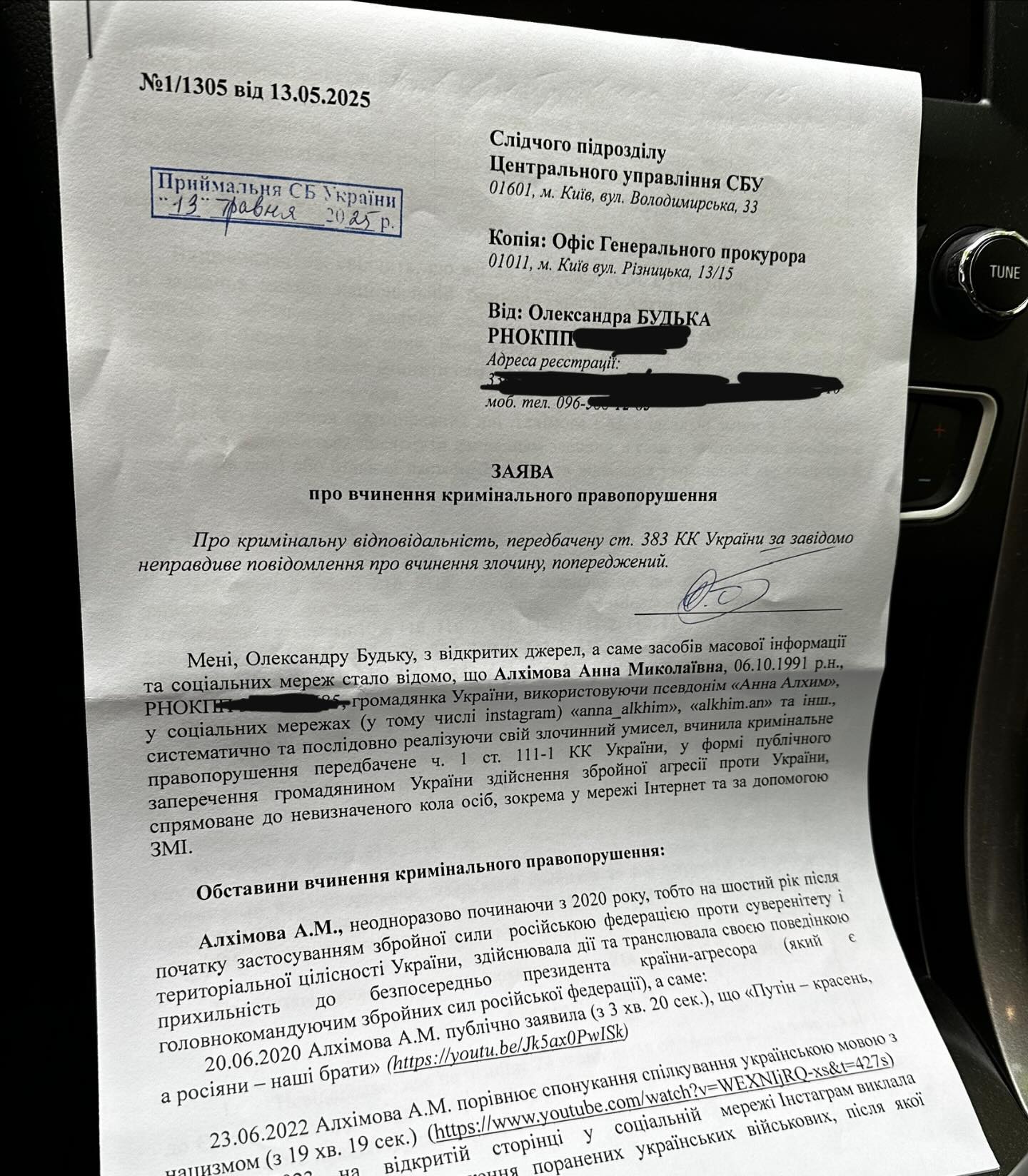 Украинский ветеран Александр Будько (Терен) обратился в Службу безопасности Украины и Офис генерального прокурора с заявлением о совершении криминального правонарушения украинским блогером из Днепра Анной Алхим. Об этом он сообщил 13 мая в соцсети Threads, разместив фото заявления.