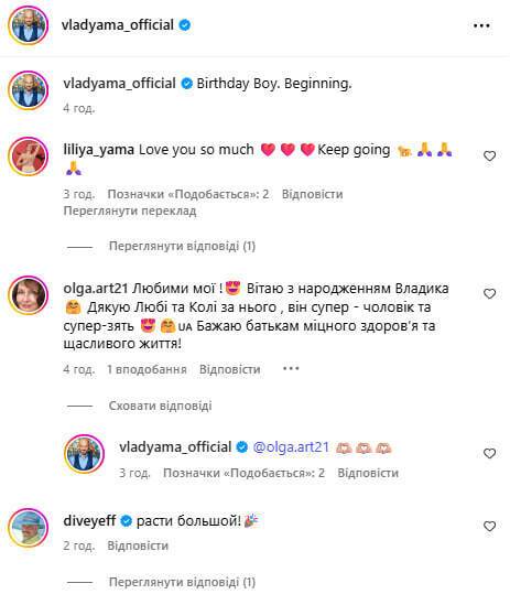 "Любимые мои. Поздравляю с рождением Владика. Спасибо Любе и Коле за него, он – супермуж и суперзять", – заявила теща Ямы.