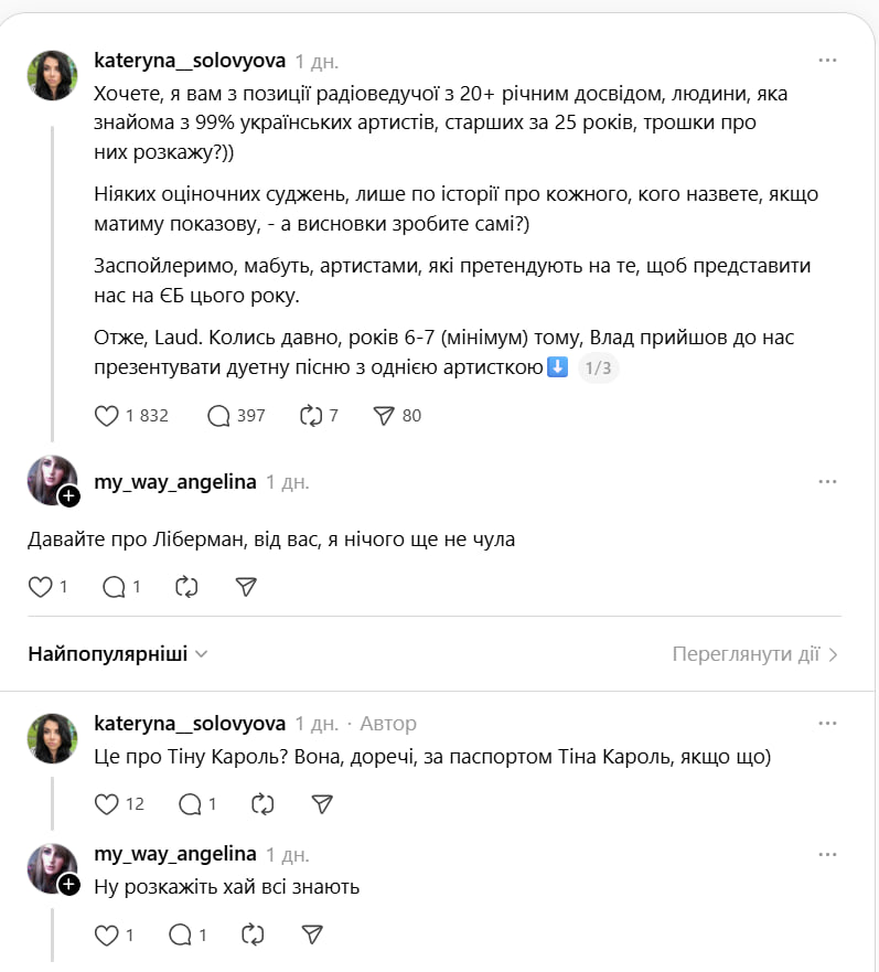 Соловьева предложила подписчикам называть фамилии артистов, которые им интересны, и рассказывала о каждом из них свое впечатление. Радиоведущая в том числе высказалась и об украинской певице Тине Кароль.