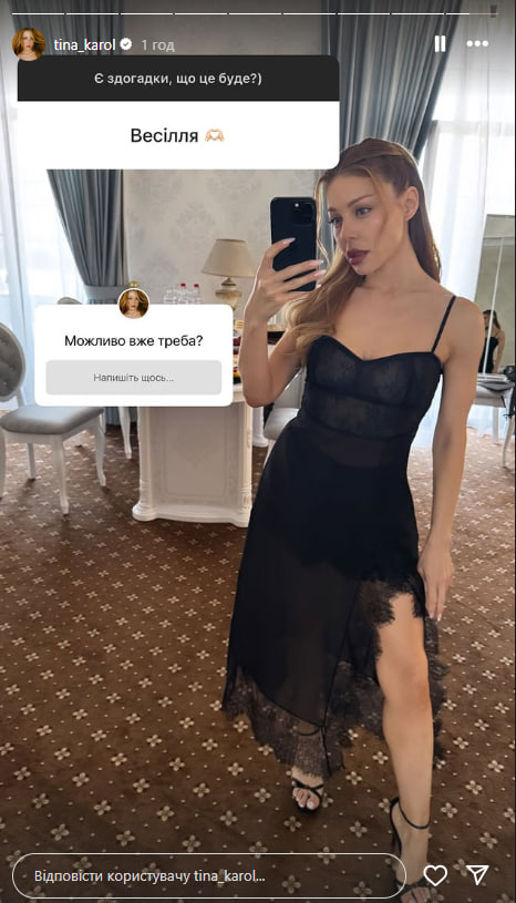 Украинская певица Тина Кароль 13 июля в Instagram Stories разместила селфи, на котором запечатлена в черном платье-комбинации и внезапно заговорила о свадьбе.