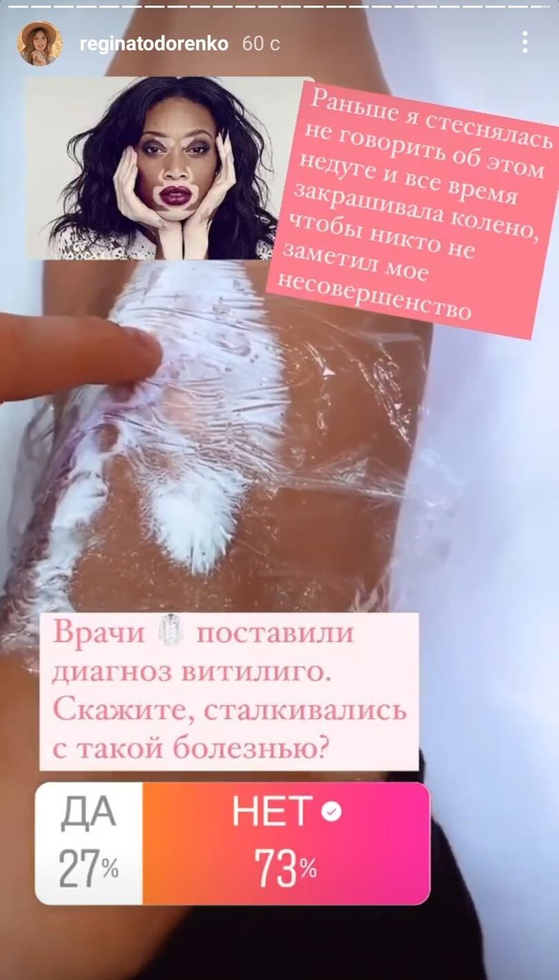 Российская ведущая украинского происхождения Регина Тодоренко 17 марта в Instagram Stories сообщила, что врачи диагностировали у нее витилиго.