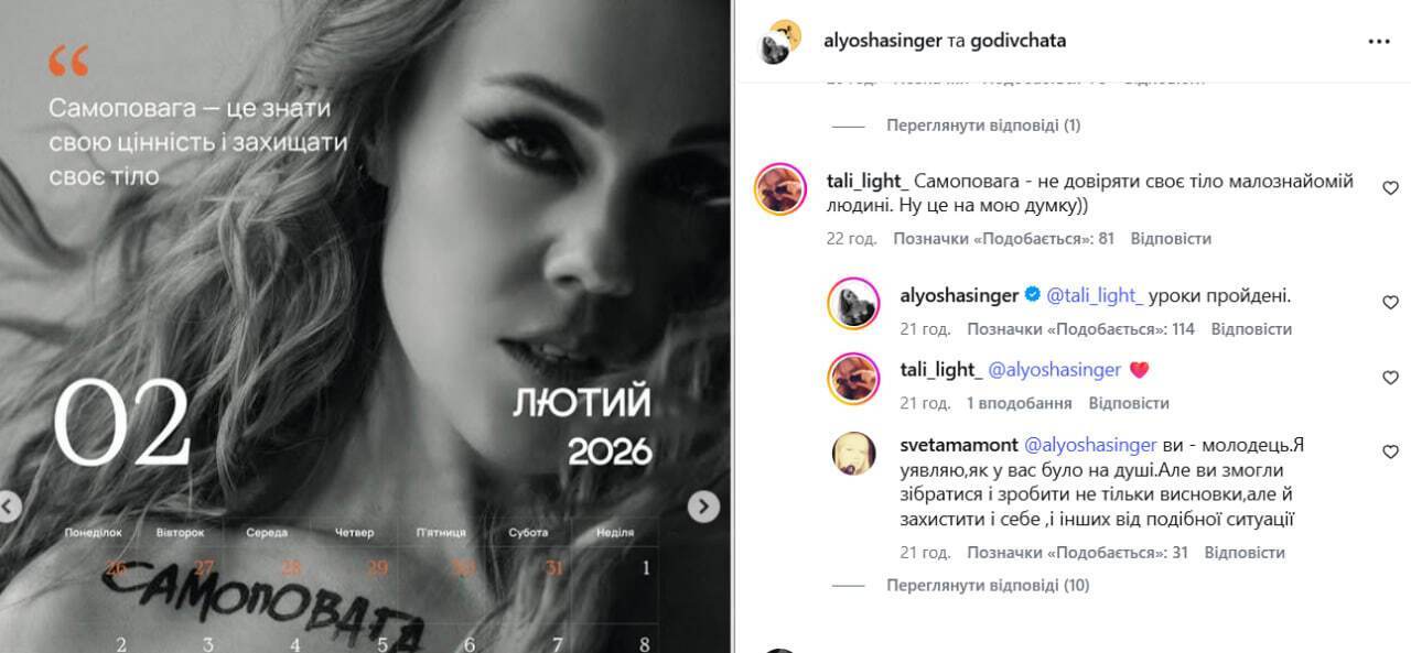 На одном из фото в календаре говорится о самоуважении, которое означает осознание своей ценности и стремления защищать свое тело.
