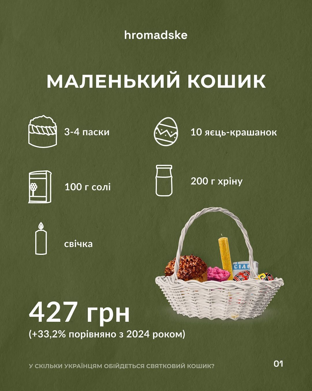 По подсчетам журналистов, маленькая корзина, в которой будет находится три или четыре маленькие паски, 100 г соли, свечка, 10 крашенок и 200 г хрена, будет стоить около 427 грн. Это примерно на 33% больше, чем было в 2024 году.