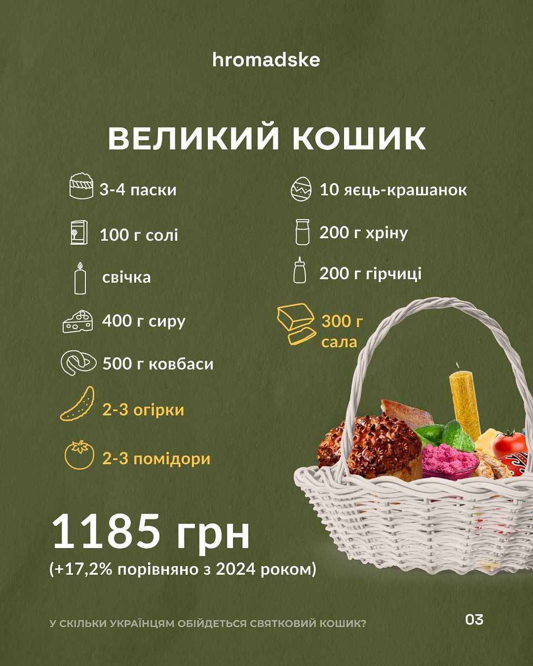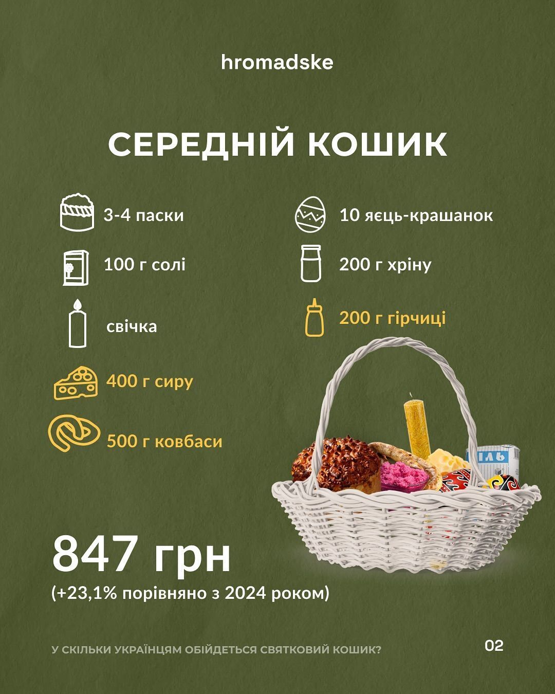 "Накануне Пасхи мы подсчитали, во сколько обойдется праздничная корзина украинцам в 2025 году, – отметили журналисты. – Цены выросли, и это заметно как для тех, кто выберет меньший набор продуктов, так и для желающих добавить в корзину больше вкусностей".