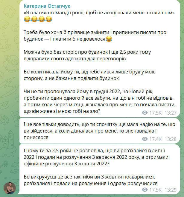 "Не ты ли предлагала ему в декабре 2022 года простить друг друга и все забыть, на что он тебе не ответил. А потом, когда узнала обо мне, то начала писать, что он живет со мной тебе назло?" – обратилась Катерина Остапчук к Кристине Остапчук.
