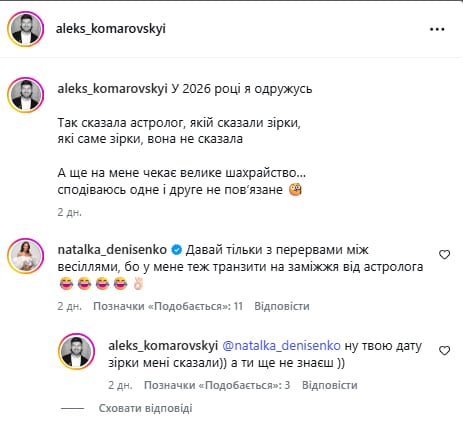 "В 2026 году я женюсь. Так сказала астролог, которой сказали звезды. Какие именно звезды, она не сказала. А еще меня ждет большой обман. Надеюсь, одно и другое не связано", – написал Комаровский.