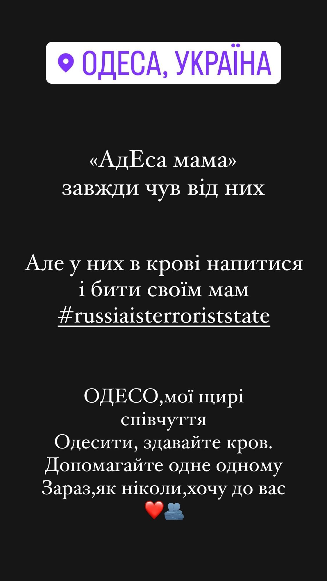 "АдЕса-мама", – всегда слышал от них. Но у них в крови напиться и бить своих мам, – написал Бедняков. – Одесса, мои искренние сочувствия. Одесситы, сдавайте кровь. Помогайте друг другу. Сейчас как никогда хочу к вам".
