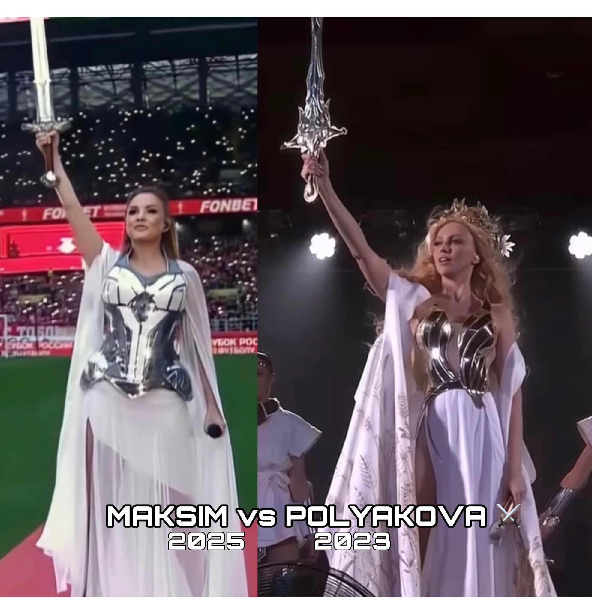 Два года назад Полякова во время концертного шоу выходила на сцену в белом платье с кольчугой и мечом. Россиянка почти полностью скопировала у Поляковой этот наряд.