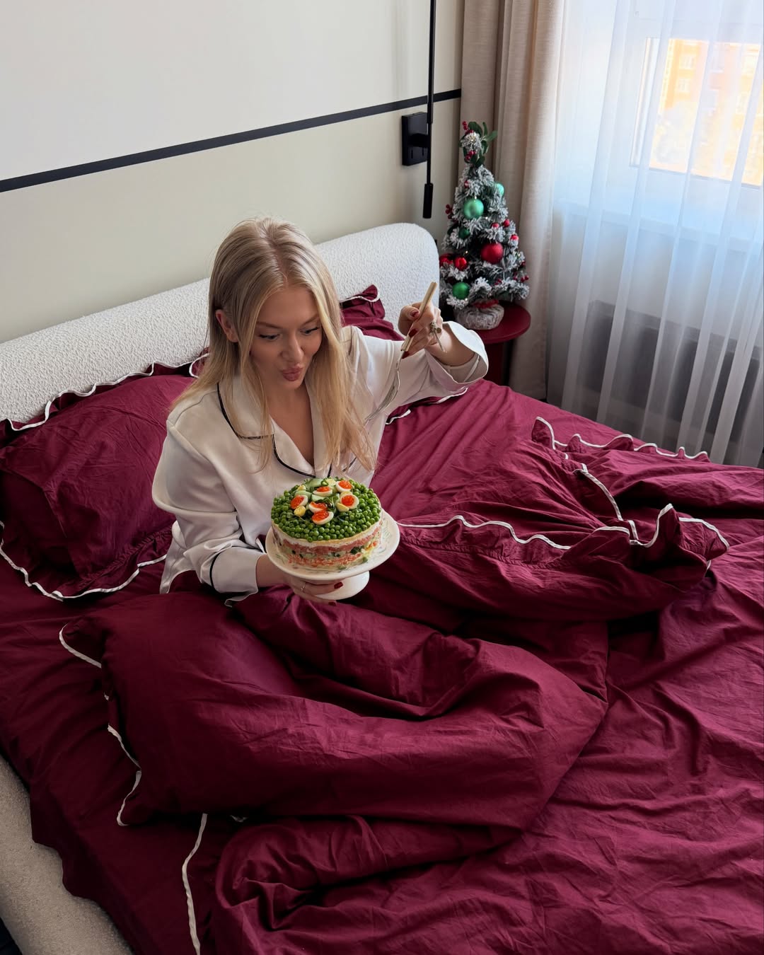 Кулинар снялась в постели, держа тарелку с салатом, а также с бокалом вина.