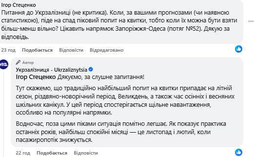 "Укрзалізниця" 5 августа, отвечая на вопросы пассажиров в Facebook, назвала два месяца в году, когда нет ажиотажа на билеты.