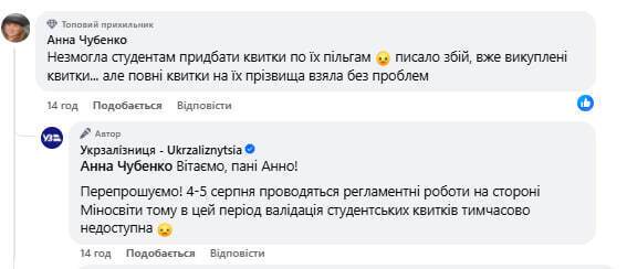 "Укрзалізниця" 5 августа, отвечая на комментарии пассажиров под своим новым постом в Facebook, подтвердила, что студенты несколько дней не могли купить билеты на поезда по студенческим билетам со скидкой.