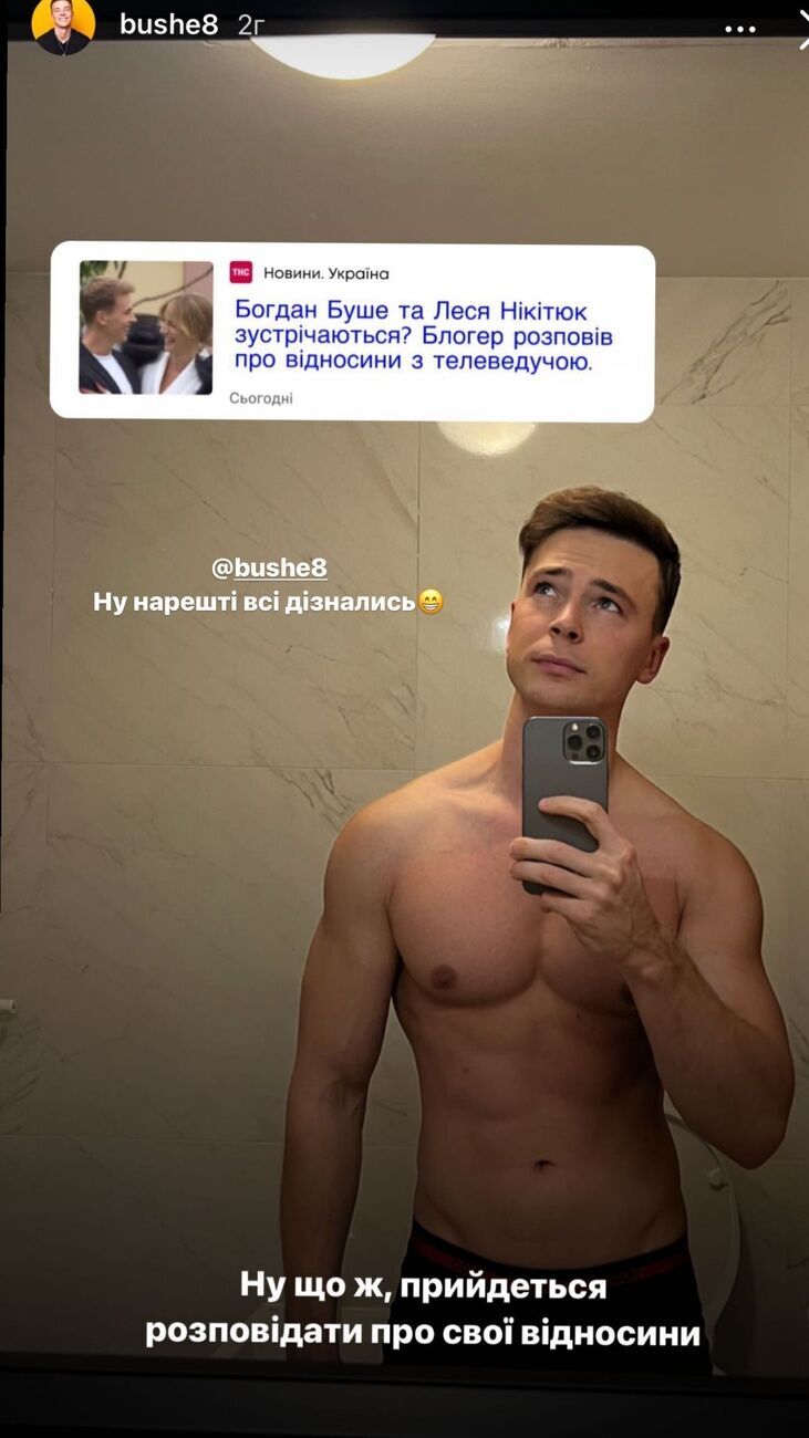 Также Никитюк поделилась постом украинского блогера Богдана Буше. Он рядом со своим снимком опубликовал заголовок материала: "Богдан Буше и Леся Никитюк встречаются? Блогер рассказал об отношениях с телеведущей".