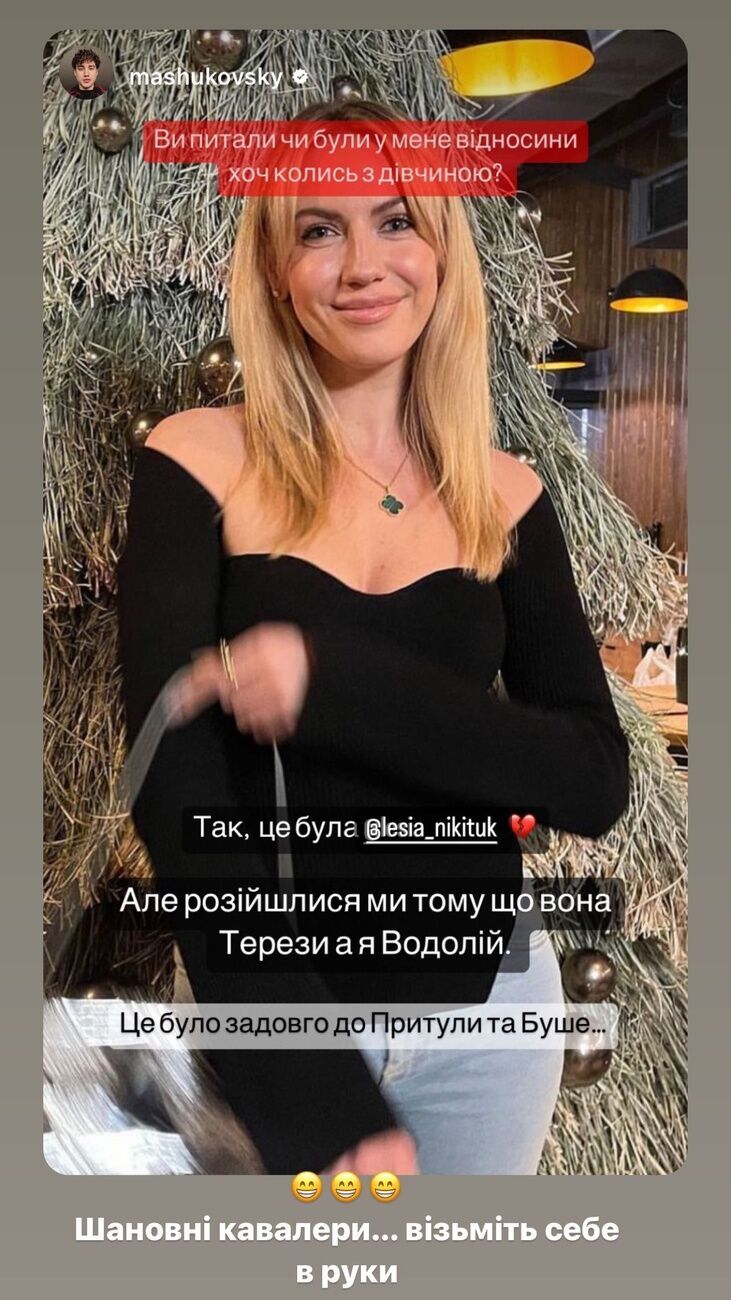 Никитюк разместила также пост украинского блогера-гомосексуала Олега Машуковского. Тот заявил, что у него были отношения с девушкой – Никитюк.
