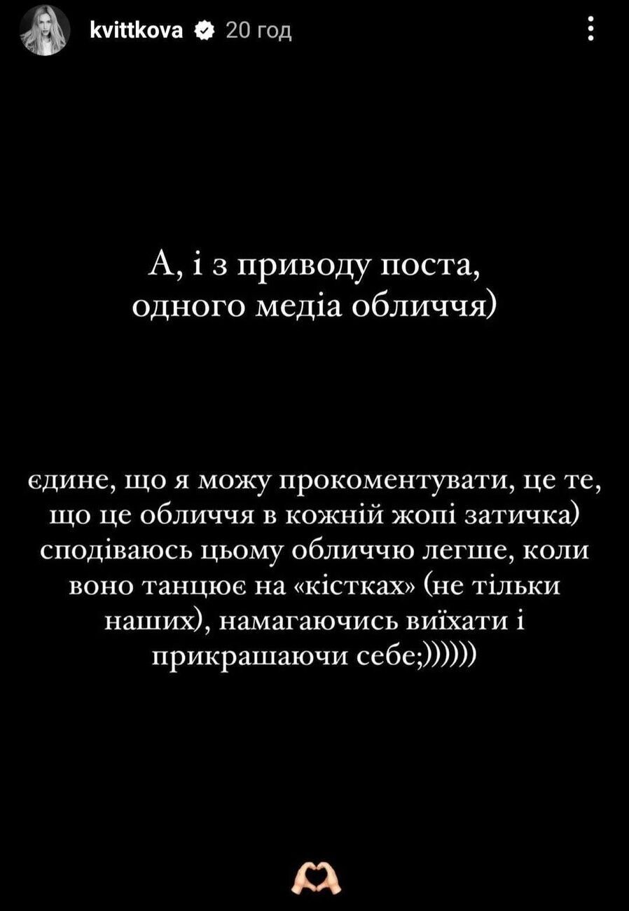 Украинский блогер, победительница шоу "Холостяк" на СТБ Даша Квиткова после того, как сообщила о расставании со своим мужем, украинским ведущим Никитой Добрыниным, 22 января в Instagram Stories разместила пост, который адресовала "одной медиаперсоне".