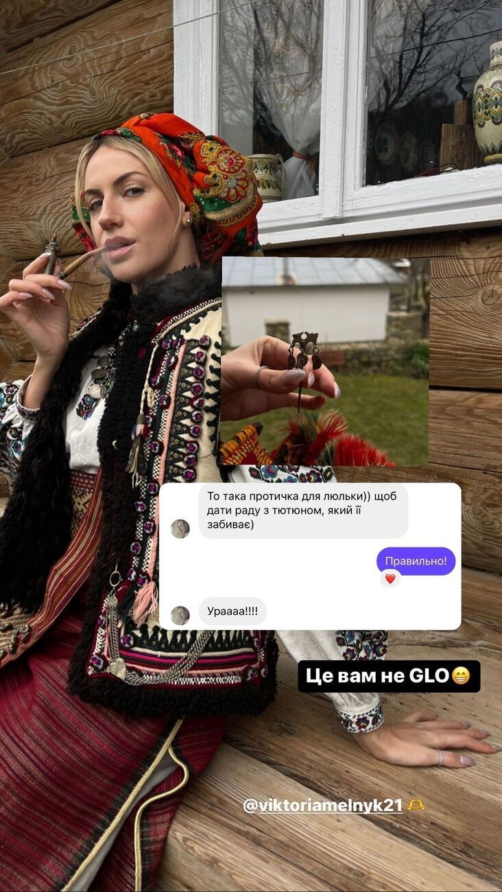 Никитюк позировала с трубкой, выпуская изо рта дым. Она также разместила фото предмета, которым проталкивают табак, чтобы трубка не засорялась.