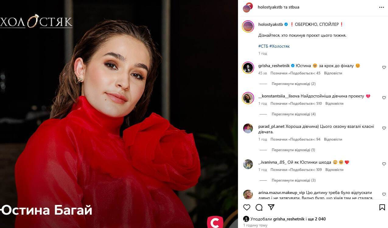 Участница 13-го сезона шоу "Холостяк" на СТБ, 21-летняя львовянка Юстина Богай покинула проект в предпоследнем эпизоде, который вышел в эфир 21 декабря. Об этом сообщается на странице шоу в Instagram.