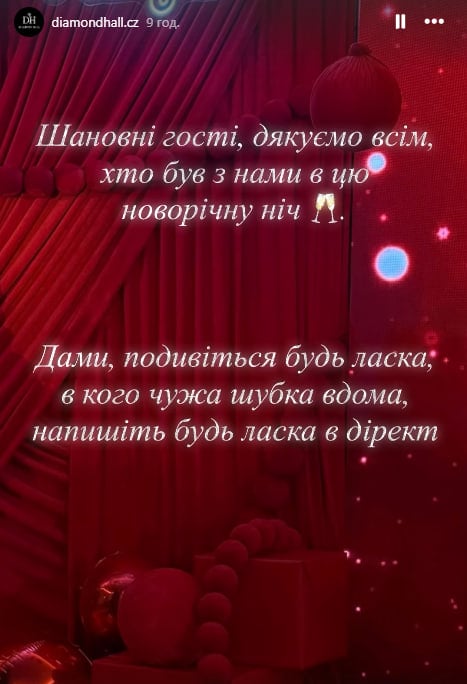 Уже после завершения новогодней вечеринки с участием Винника администрация заведения разместила в Instagram Stories объявление о том, что одна из гостей осталась без шубы.