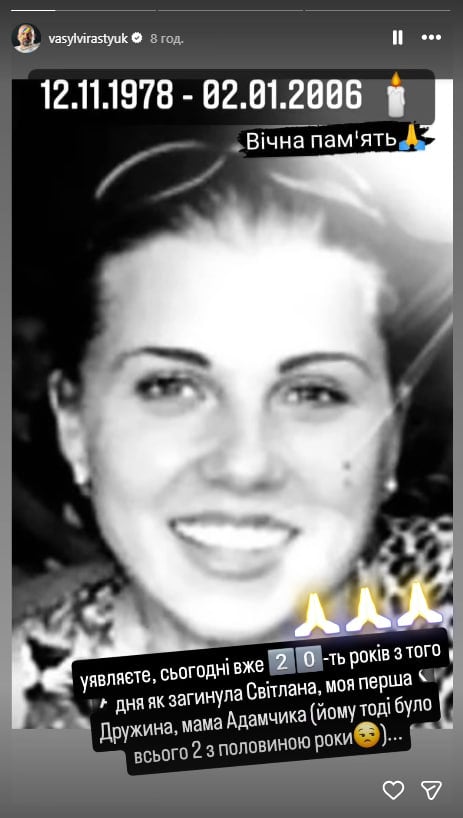 "Вечная память. Представляете, сегодня уже 20 лет с того дня, как погибла Светлана. Моя первая жена, мама Адамчика. Ему тогда было всего два с половиной года", – написал Вирастюк.