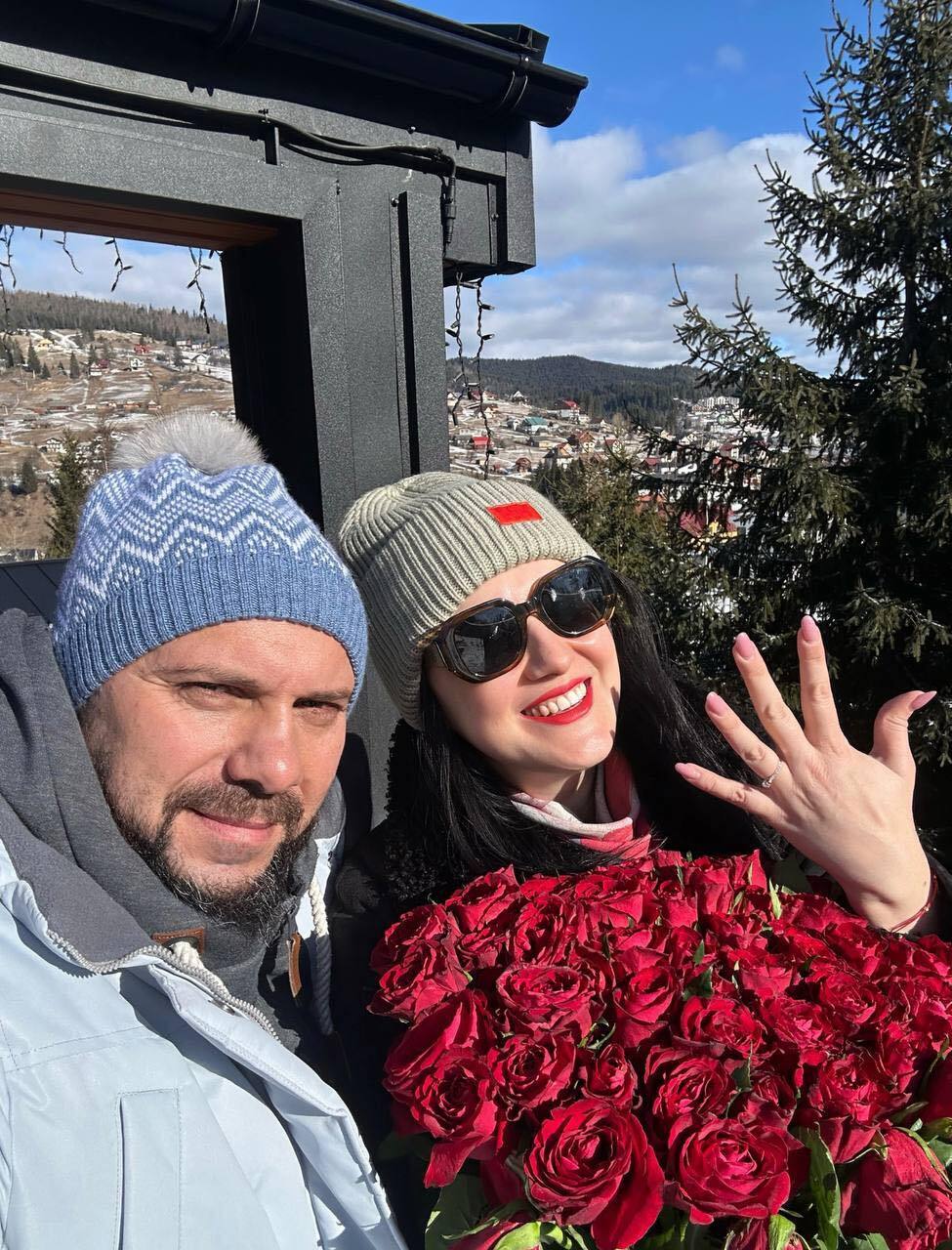На фотографии Ситайло и Витвицкая позируют на фоне гор. Ведущая держит букет роз и показывает обручальное кольцо на безымянном пальце.