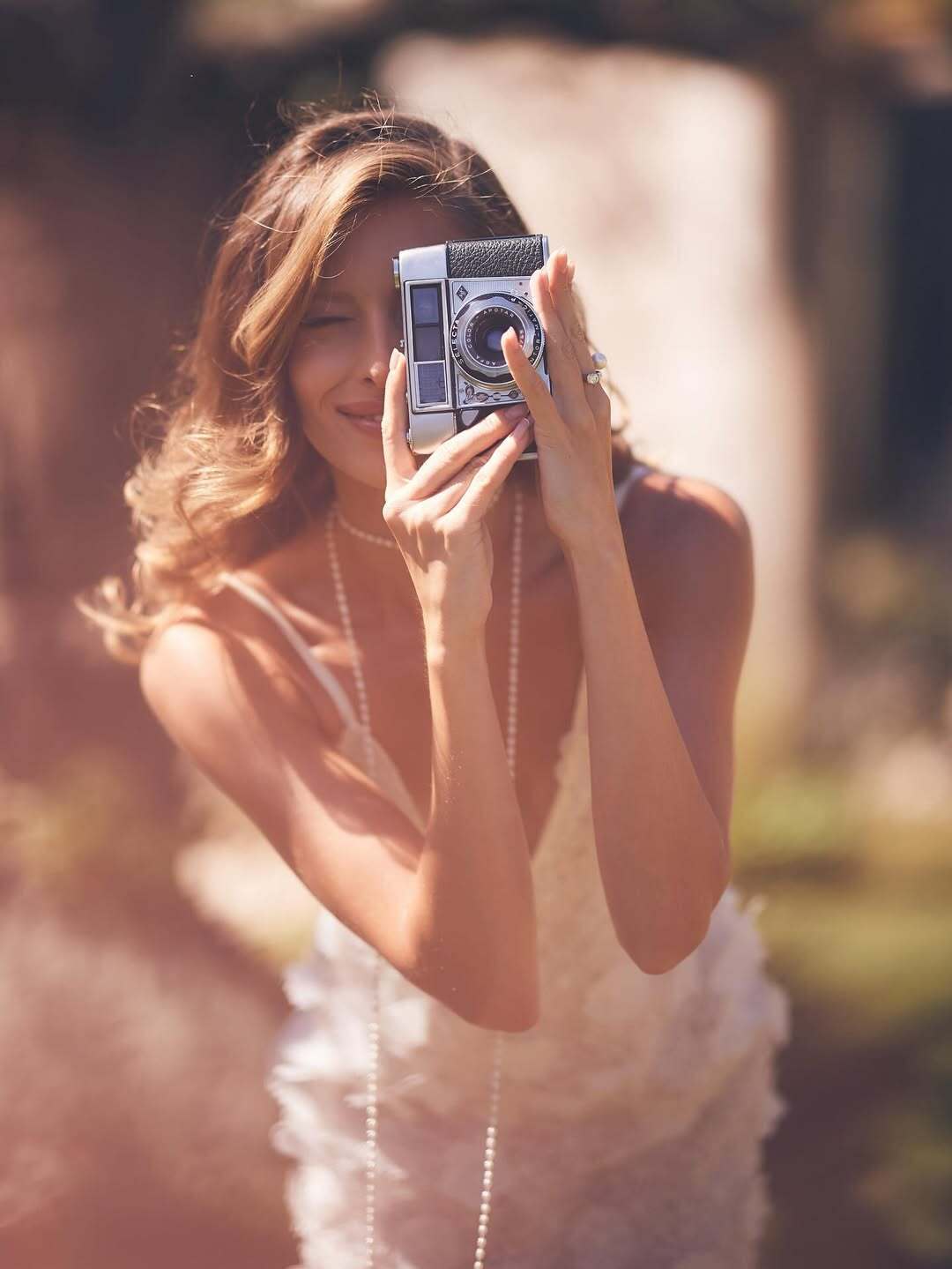 Внучка Ротару позировала с фотоаппаратом в руках. Она появилась в кружевном белом платье на тонких бретелях. Образ она дополнила ожерельем из жемчуга.