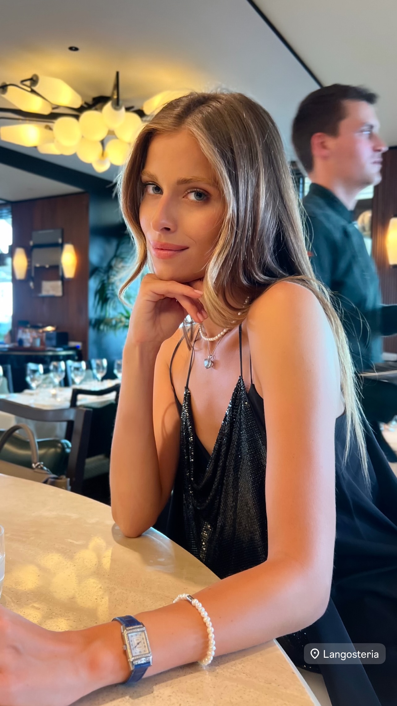 Евдокименко предстала в черном блестящем платье на тонких бретелях и с распущенными волосами. Она сидела за столиком в ресторане, поддерживая одной рукой подбородок, а другую положив на стол.