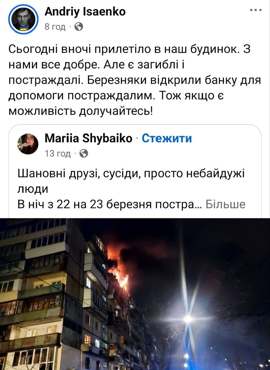 Украинский актер Андрей Исаенко в Facebook сообщил, что в ночь на 23 марта обломок сбитого российского дрона попал в многоквартирный дом на левом берегу Киева, в котором он проживает.