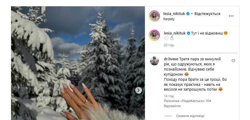 Военный медик крымскотатарского происхождения Асан Исенаджиев, который познакомил украинскую ведущую Лесю Никитюк с ее женихом, публично высказался о намерении пары зарегистрировать брак. Свой комментарий он оставил под постом Никитюк в Instagram, в котором она сообщила о помолвке.