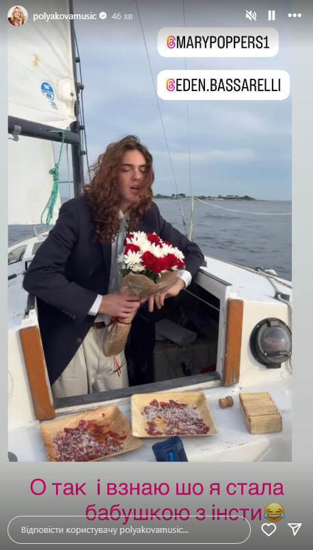 В ролике дочь артистки запечатлена на небольшой яхте в компании молодого человека по имени Эден Пассарелли, который признается ей в любви и делает предложение руки и сердца. Мария Полякова ответила ему согласием. На Instagram-странице Пссарелли указано, что он музыкант.