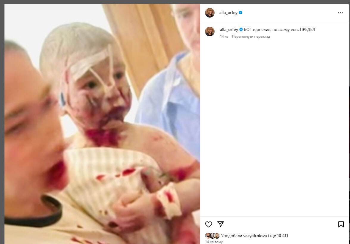 Свой пост она проиллюстрировала снимком, на котором запечатлен раненый во время обстрела маленький пациент больницы.