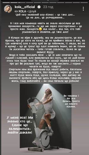 "Вы реально тупые, если так мыслите. И карма ждать не будет, поверьте. Испортили нам все впечатление от нашей работы, многим испортили. Поверьте, без прикола, из-за этого у вас в жизни будет какая-то беда очень сложная – или ребенка не сможете сделать, или еще что-то более ужасное, болезнь какая-то. Поэтому, извините, вы сами видели, что делали, – написала Kola. – Вы твари и бог все видит".