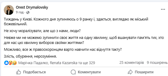 "Неделю в Киеве. Каждый день останавливаюсь в 9.00 и, кажется, выгляжу как городской сумасшедший. Не хочу морализовать, но что с нами, люди? – обратился он к подписчикам. – Неужели мы не можем остановить свою жизнь на одну минуту, чтобы почтить память тех, кто для нас эту минуту завоевал своими жизнями? Возможно, правоохранителям стоит научить нас ощущению такта?"