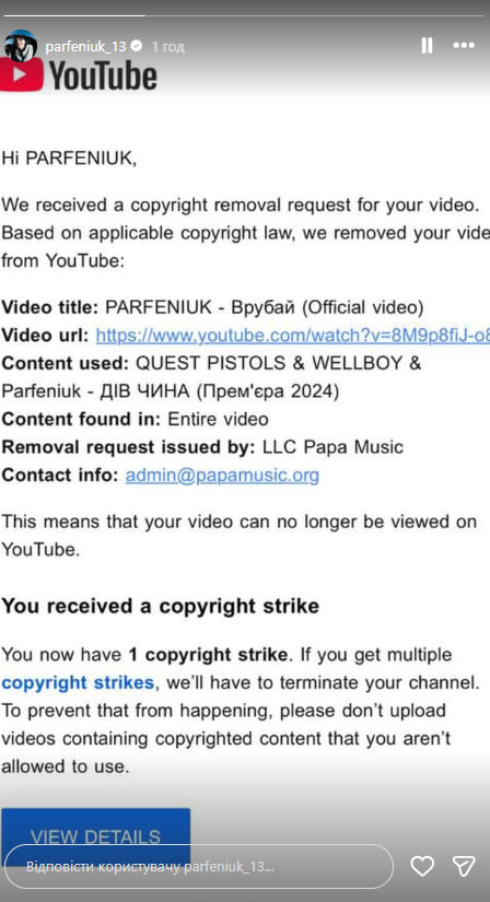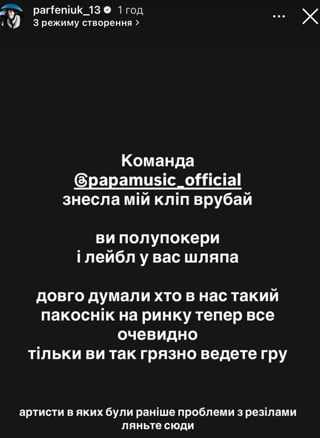 Украинский певец Parfeniuk 18 ноября в Instagram Stories заявил, что из-за жалобы украинского лейбла Papa music YouTube удалил его клип на хит "Врубай".